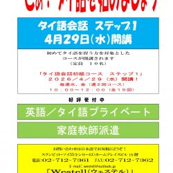 タイ語会話初心者用のグループコースを次の日程にて開催いたします。 開講予定日:2026年4月29日(水) 日時:毎週水曜日&金曜日 10:00-12:00 (祝祭日、日本人学校がお休みの日はレッスンもお休みとなります) Read more about 2026年4月タイ語初心者向けグループコース開講のお知らせ[…]